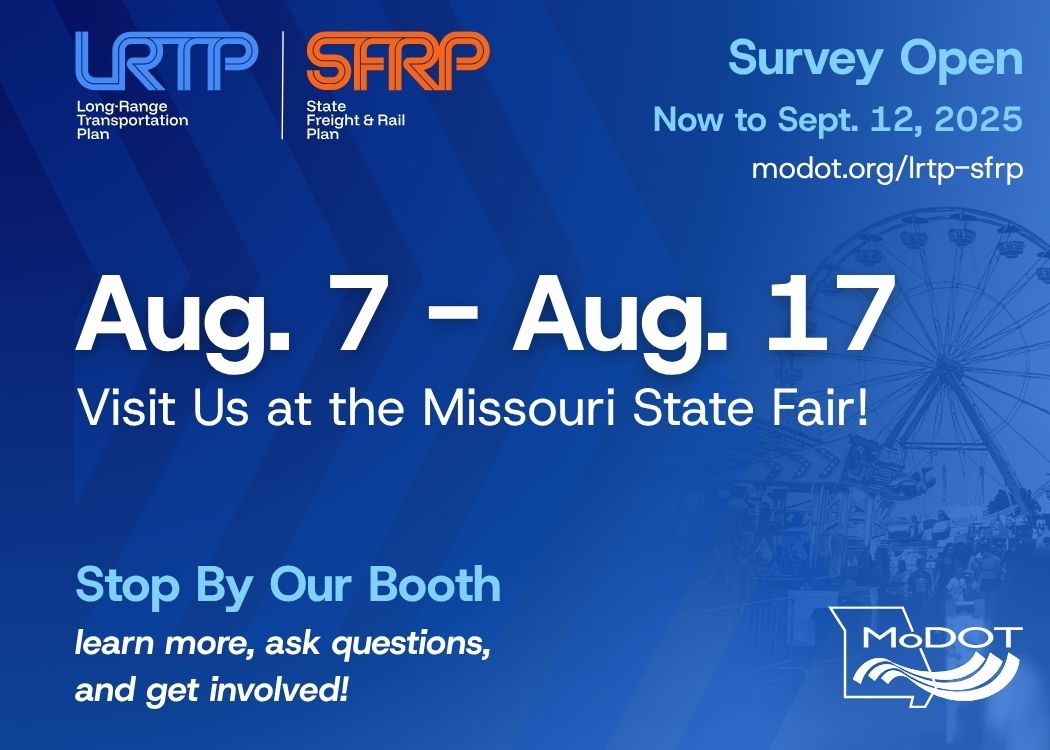 MoDOT will host an in-person gathering at the Missouri State Fair for you to share your feedback on MoDOT's LRTP Goals and Objectives.