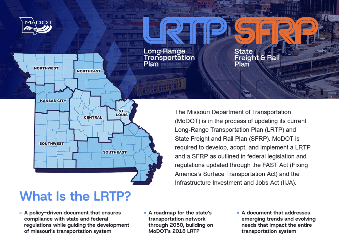 • The Missouri Department of Transportation [MoDOT] is seeking feedback on the goals and objectives for the update to their Long-Range Transportation Plan [LRTP].
