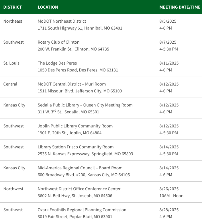 MoDOT is also hosting a series of presentations around the state in August 2025 for their High Priority Unfunded Needs List. These mee